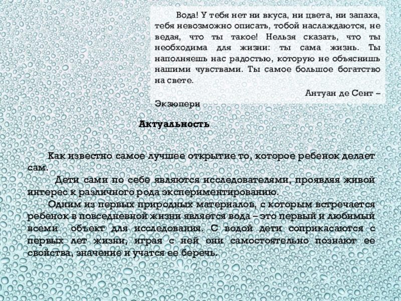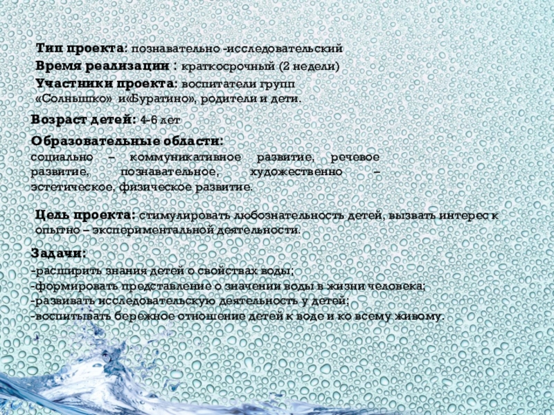 Одним из первых природных материалов, с которым встречается ребенок в повседневной жизни является вода – это первый и любимый всеми объект для исследования. С водой дети соприкасаются с первых лет жизни, играя с ней они самостоятельно познают ее свойства, значение и учатся ее беречь.