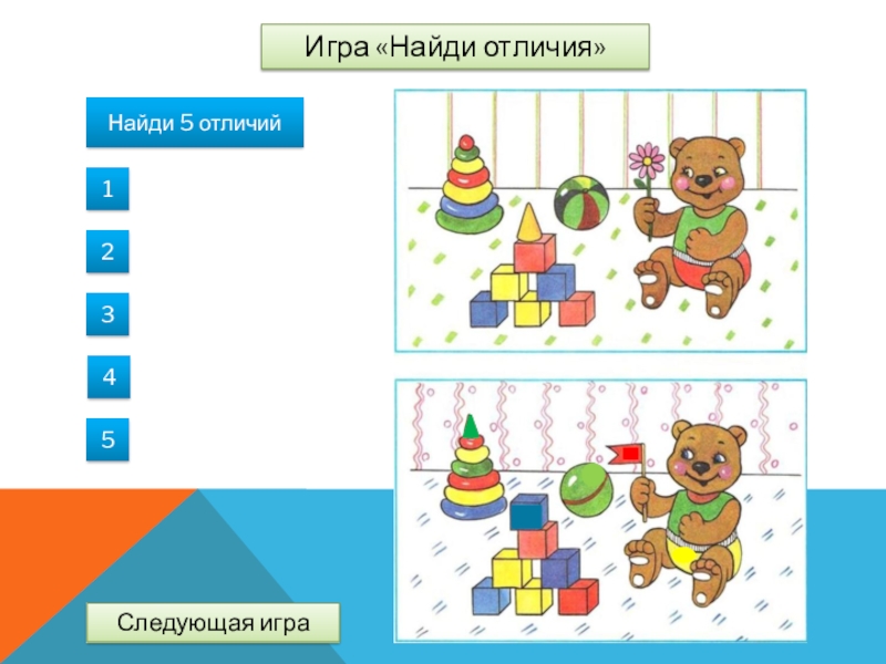 Игра «Найди отличия»Найди 5 отличий12345Следующая игра