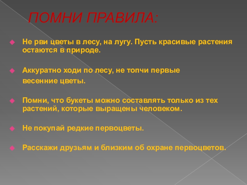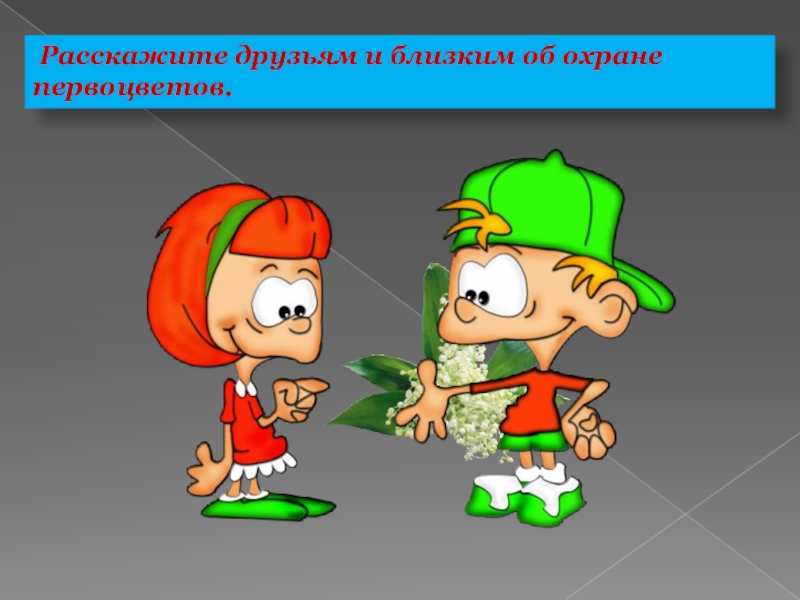 Слайд 19 Расскажите друзьям и близким об охране первоцветов.