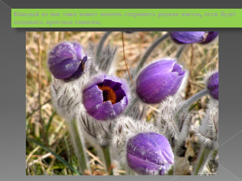 Слайд 14Каждый из нас тоже может помочь сохранить редкие цветы, если будет