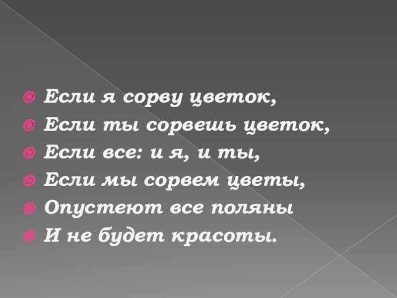 Если я сорву цветок,Если ты сорвешь цветок,Если все: и я, и ты,Если мы сорвем цветы,Опустеют все поляныИ