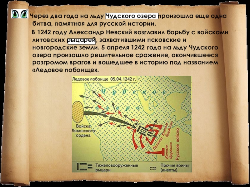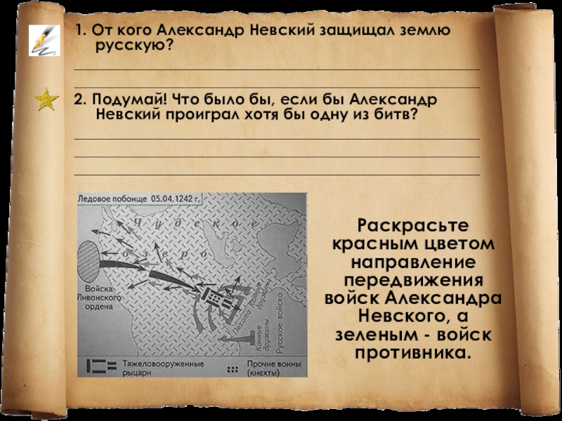 Раскрасьте красным цветом направление передвижения войск Александра Невского, а зеленым - войск противника.