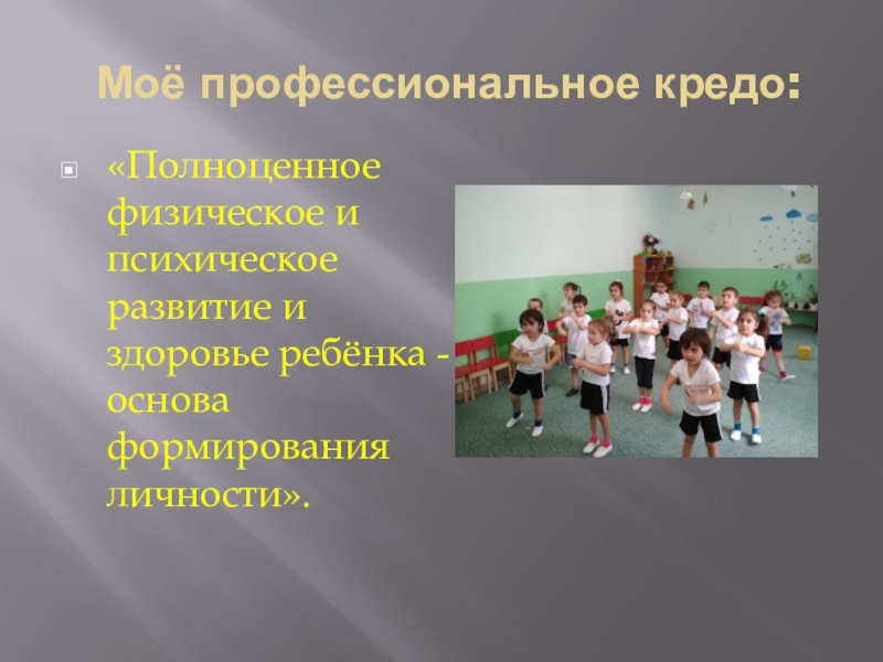 Я всегда стараюсь провести образовательную деятельность увлекательно, необычно ярко, помимо физических навыков стараюсь воспитать дисциплинированность, умение работать в команде, чуствовать уверенность в своих силах. Моя работа требует необыкновенной самоотдачи, преданности профессии. И самая высокая оценка моего труда- это доверие ребенка и простое человеческое спасибо родителей.