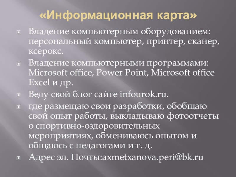Адрес эл. Почты:axmetxanova.peri@bk.ru
