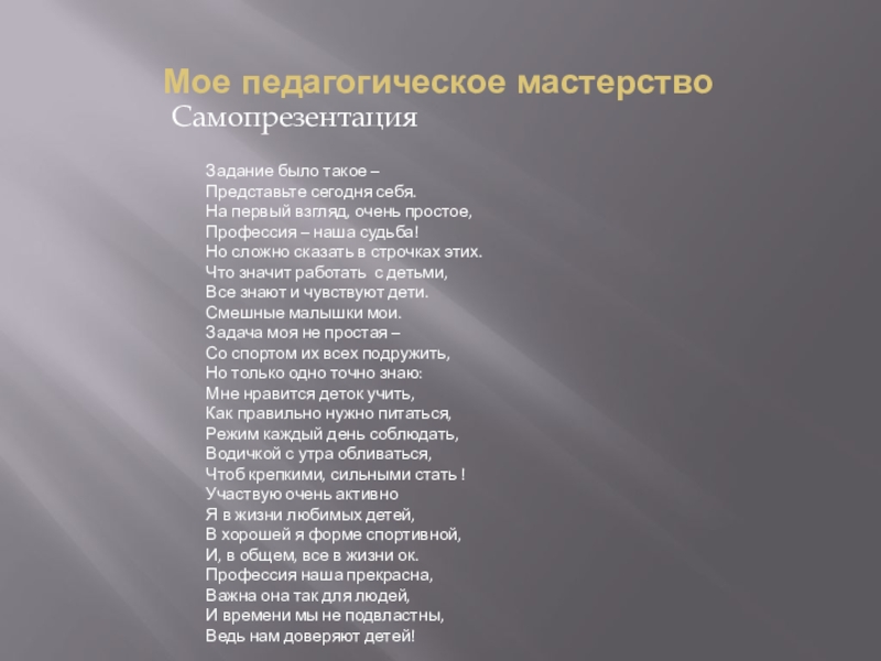 Я инструктор по физической культуре, а значит наставник, учитель и друг для своих воспитанников. От меня зависит какой «багаж» представлений о здоровосм образе жизни , какие потребности в физическом совершенствовании получают дети в результате общения сомной как с педагогом , который всегда найдет интересное дело . В той жизни, которую я для себя выбрала, нужно иметь много терпения, мужества и стойкости.