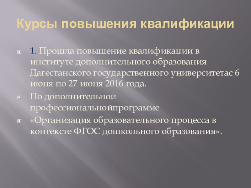 1. Прошла повышение квалификации в институте дополнительного образования Дагестанского