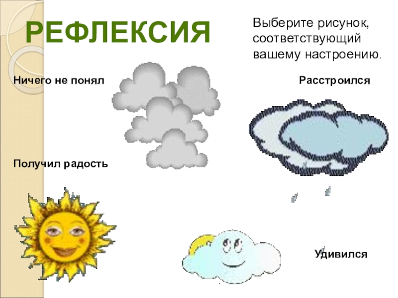 Выберите рисунок, соответствующий вашему настроению.    РЕФЛЕКСИЯРасстроился Получил радость Удивился Ничего не понял