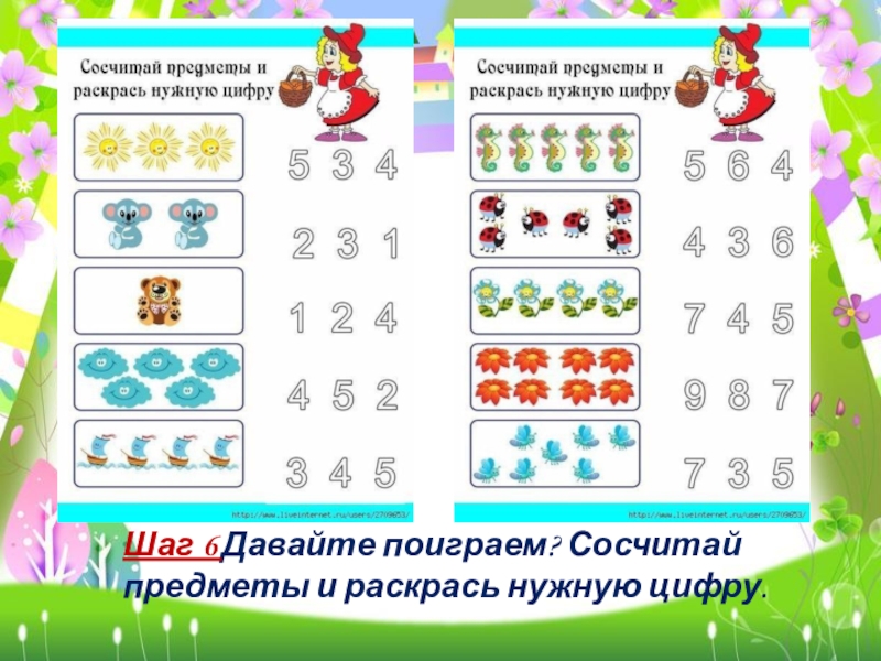 Слайд 12Шаг 6 Давайте поиграем? Сосчитай предметы и раскрась нужную цифру.