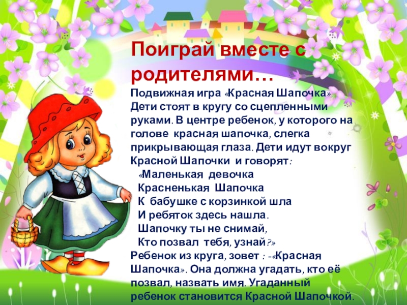 сцепленными руками. В центре ребенок, у которого на голове красная шапочка, слегка прикрывающая глаза. Дети идут вокруг Красной Шапочки и говорят: