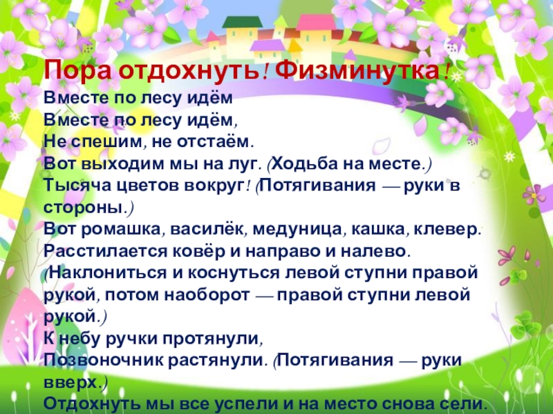 Отдохнуть мы все успели и на место снова сели. (Дети садятся.)
