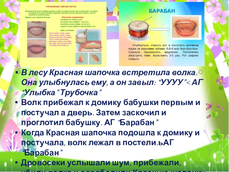 В своей корзинке она несла пирожок и горшочек масла для бабушки. АГ “Пирожок” - рот открыт. Боковые края языка загнуты вверх. АГ“Чашечка”