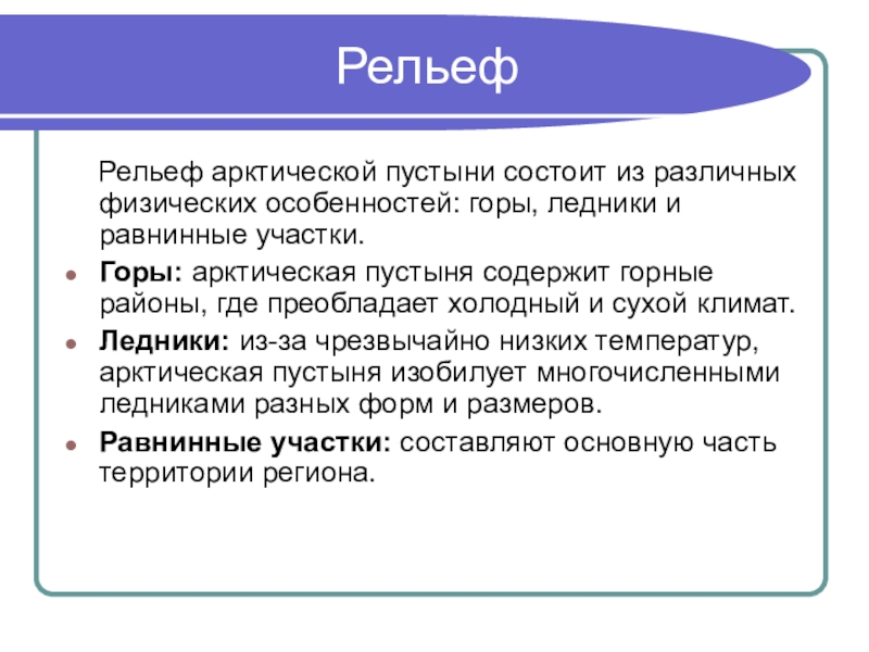 Рельеф арктической пустыни состоит из различных физических особенностей: горы, ледники и равнинные участки.
