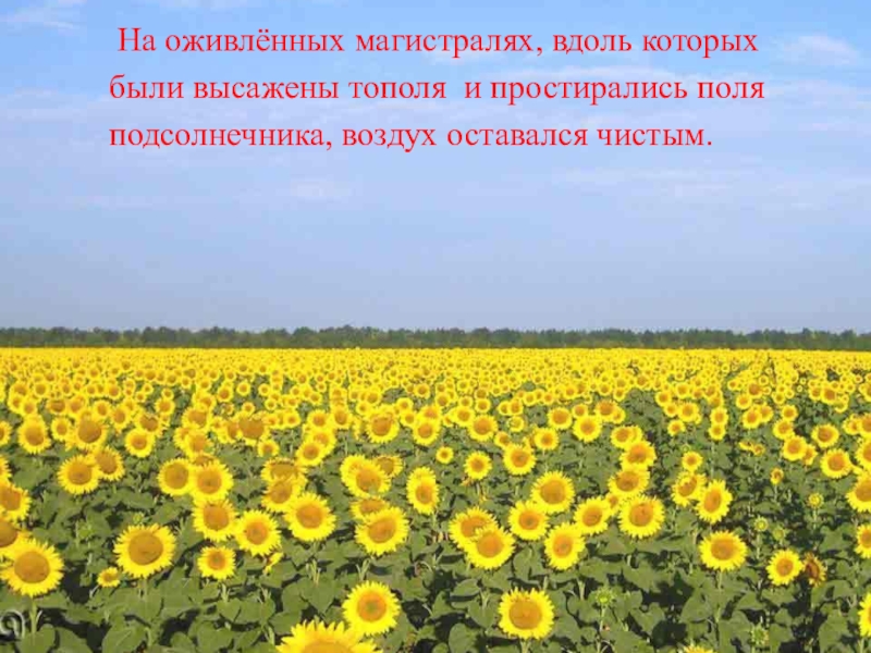 На оживлённых магистралях, вдоль которых были высажены тополя и простирались поля подсолнечника, воздух оставался чистым.