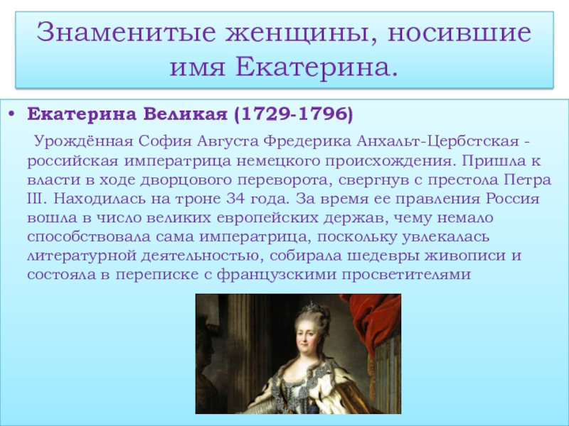 Знаменитые женщины, носившие имя Екатерина.  Екатерина Великая (1729-1796)  	Урождённая София Августа Фредерика Анхальт-Цербстская -