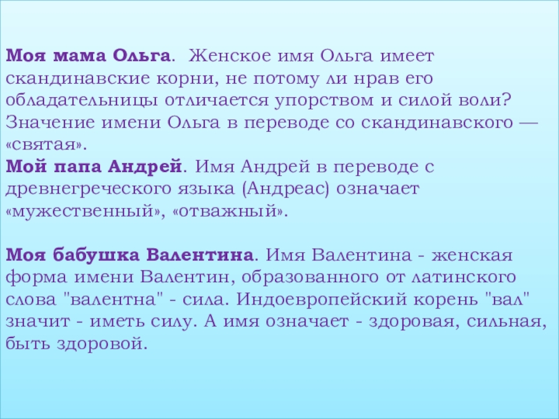 ли нрав его обладательницы отличается упорством и силой воли? Значение имени Ольга в переводе со скандинавского — «святая». Мой папа Андрей. Имя Андрей в переводе с древнегреческого языка (Андреас) означает «мужественный», «отважный». Моя бабушка Валентина. Имя Валентина - женская форма имени Валентин, образованного от латинского слова "валентна" - сила. Индоевропейский корень "вал" значит - иметь силу. А имя означает - здоровая, сильная, быть здоровой.