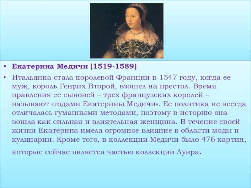 муж, король Генрих Второй, взошел на престол. Время правления ее сыновей – трех французских королей – называют «годами Екатерины Медичи». Ее политика не всегда отличалась гуманными методами, поэтому в историю она вошла как сильная и влиятельная женщина. В течение своей жизни Екатерина имела огромное влияние в области моды и кулинарии. Кроме того, в коллекции Медичи было 476 картин, которые сейчас является частью коллекции Лувра.
