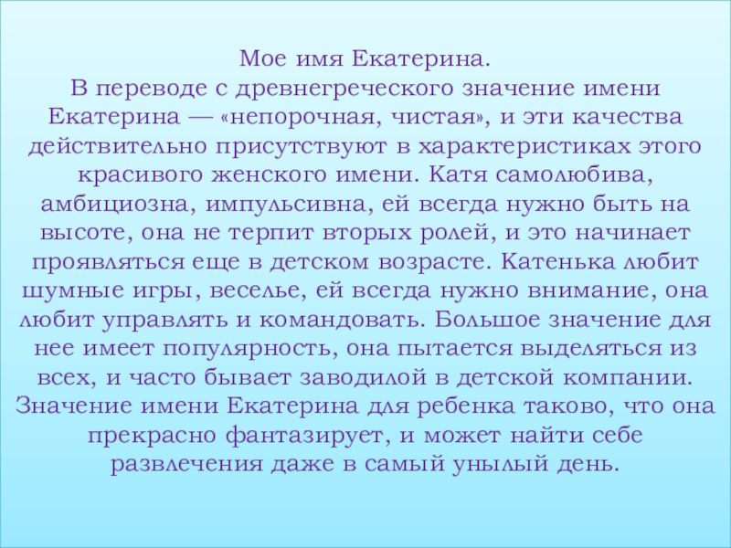 Мое имя Екатерина. В переводе с древнегреческого значение имени Екатерина — «непорочная, чистая», и эти качества действительно