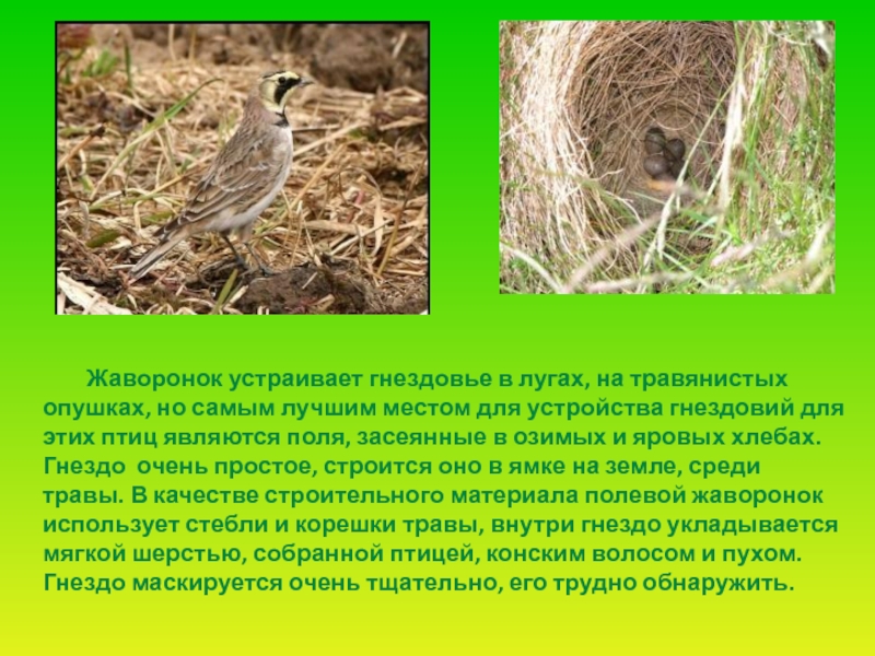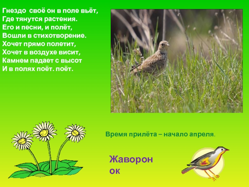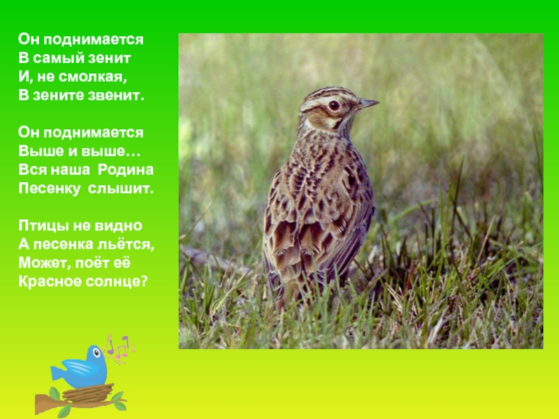 Слайд 19Гнездо своё он в поле вьёт,