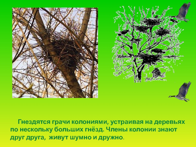 Слайд 13 Гнездятся грачи колониями, устраивая на деревьях