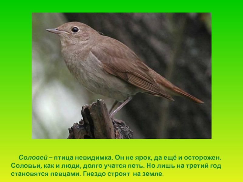 Слайд 34 Соловей – птица невидимка. Он не ярок, да