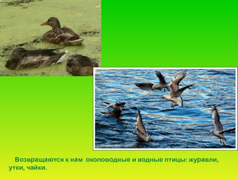 Слайд 40 Возвращаются к нам околоводные и водные птицы: журавли, утки,