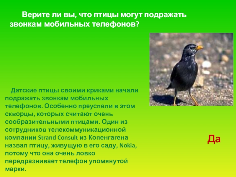 Слайд 55 Датские птицы своими криками начали подражать звонкам мобильных телефонов.