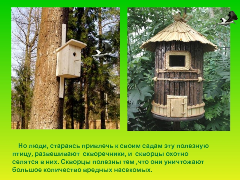 птицу, развешивают скворечники, и скворцы охотно