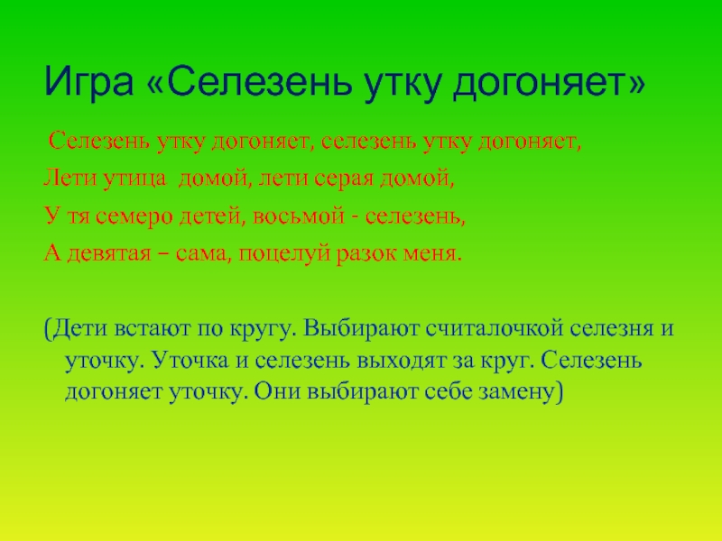 (Дети встают по кругу. Выбирают считалочкой селезня и уточку. Уточка и селезень выходят за круг. Селезень догоняет уточку. Они выбирают себе замену)