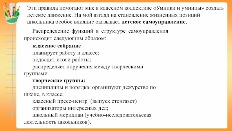 дисциплины и порядка: организуют дежурство по школе, в классе;