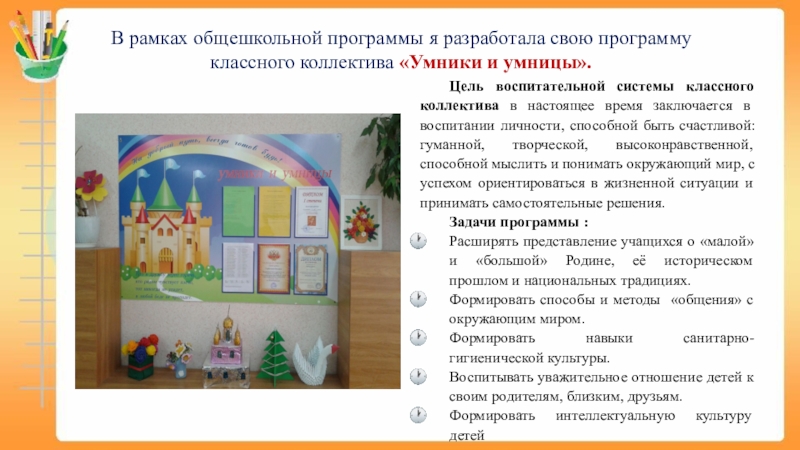 Цель воспитательной системы классного коллектива в настоящее время заключается в воспитании личности, способной быть счастливой: гуманной, творческой, высоконравственной, способной мыслить и понимать окружающий мир, с успехом ориентироваться в жизненной ситуации и принимать самостоятельные решения.