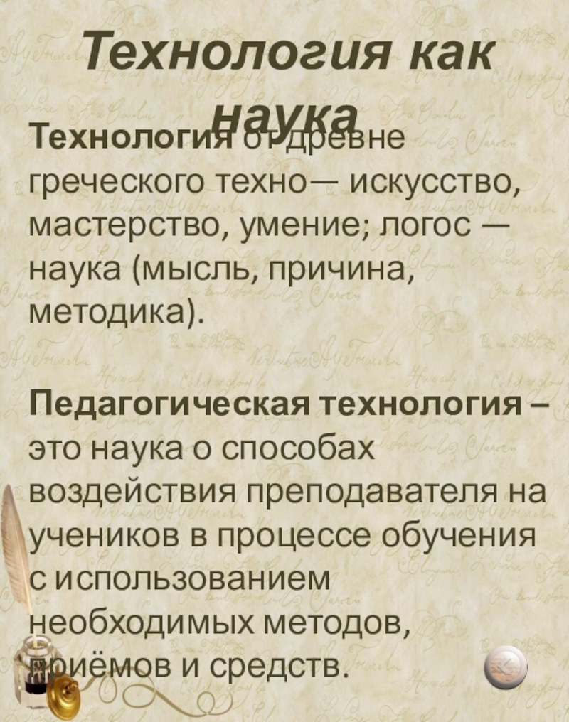 Технология от древне греческого техно— искусство, мастерство, умение; логос — наука