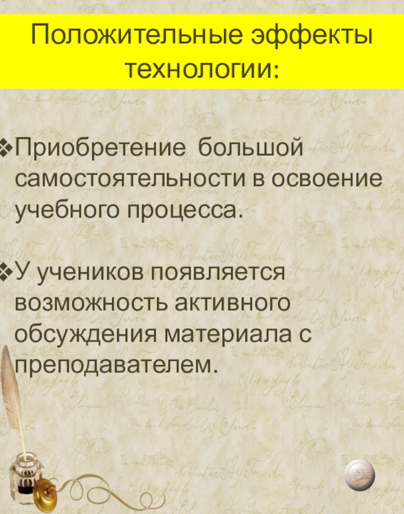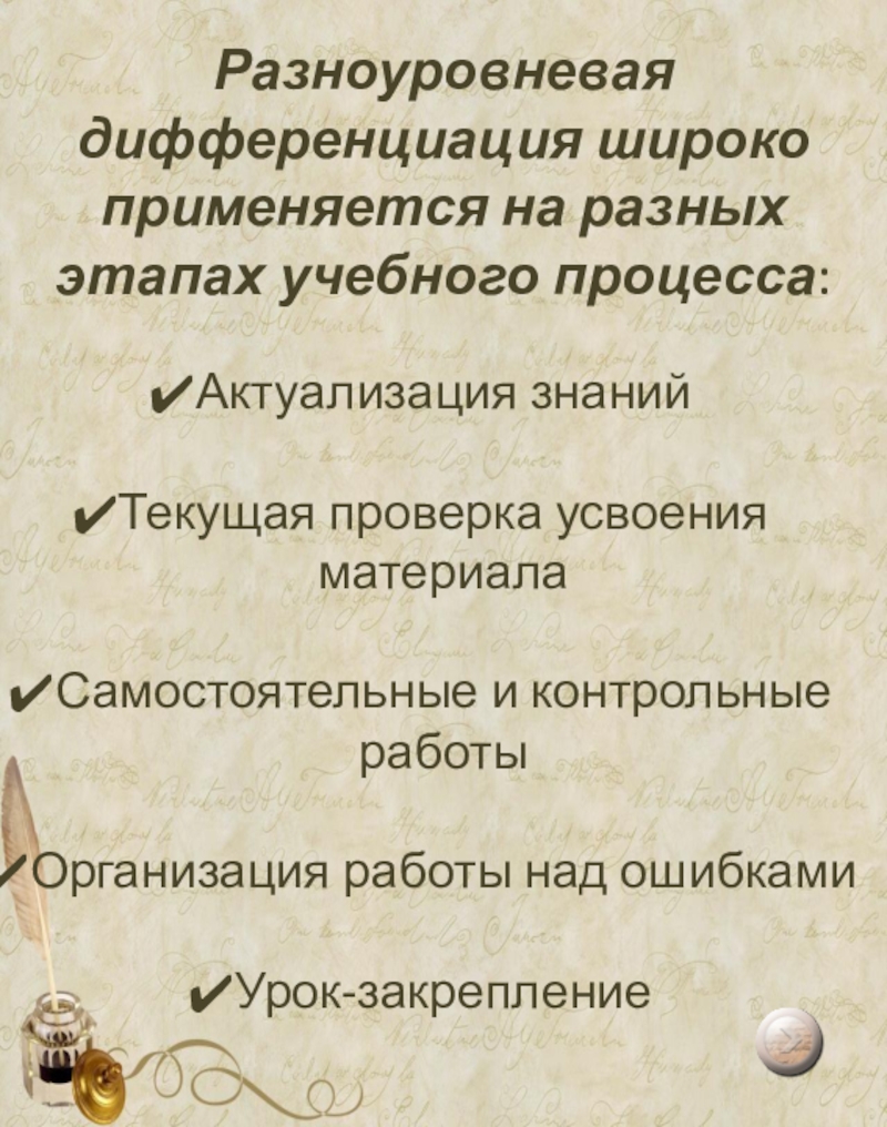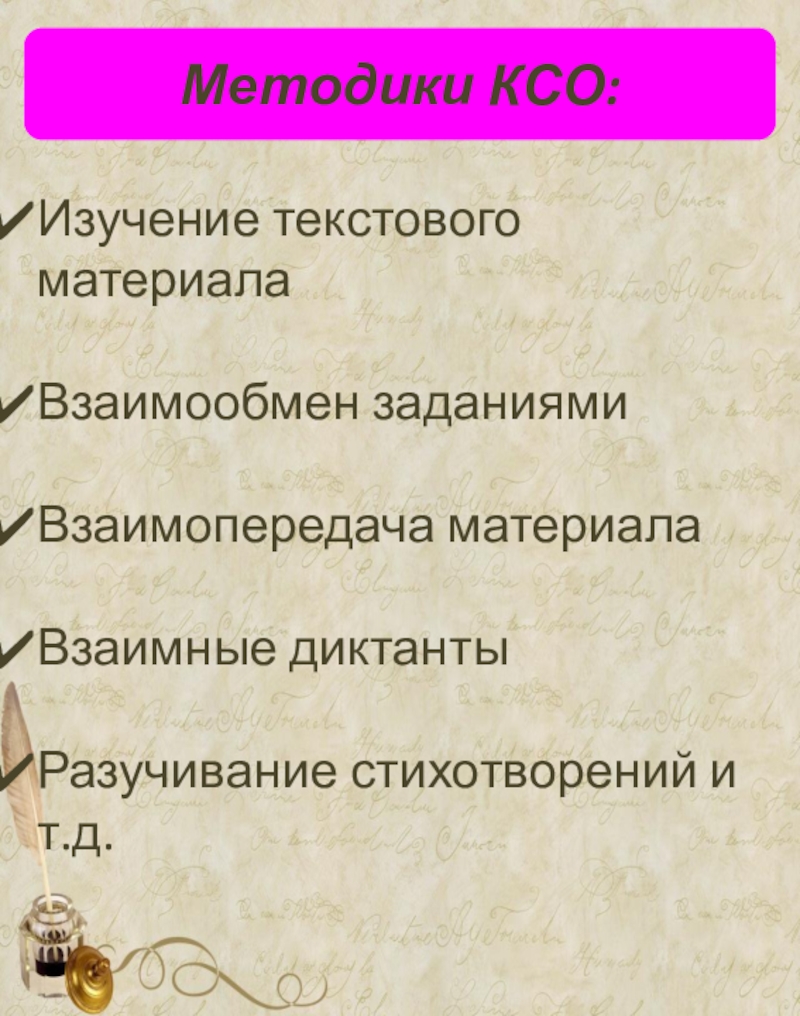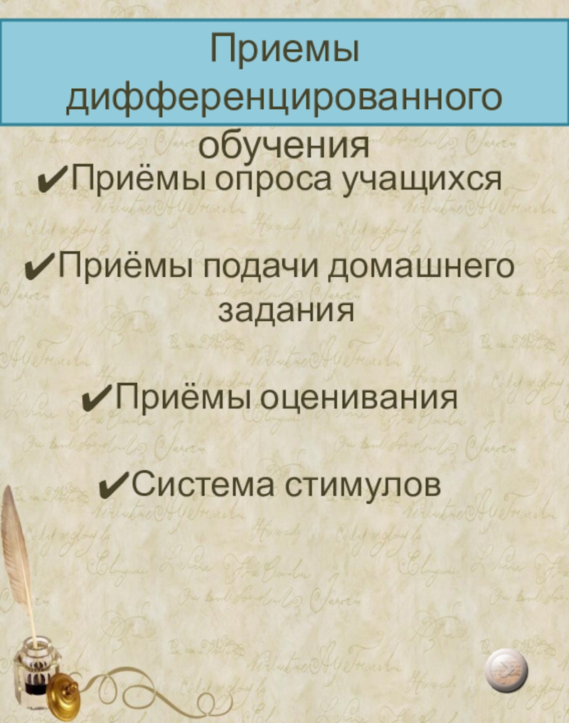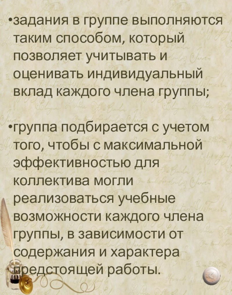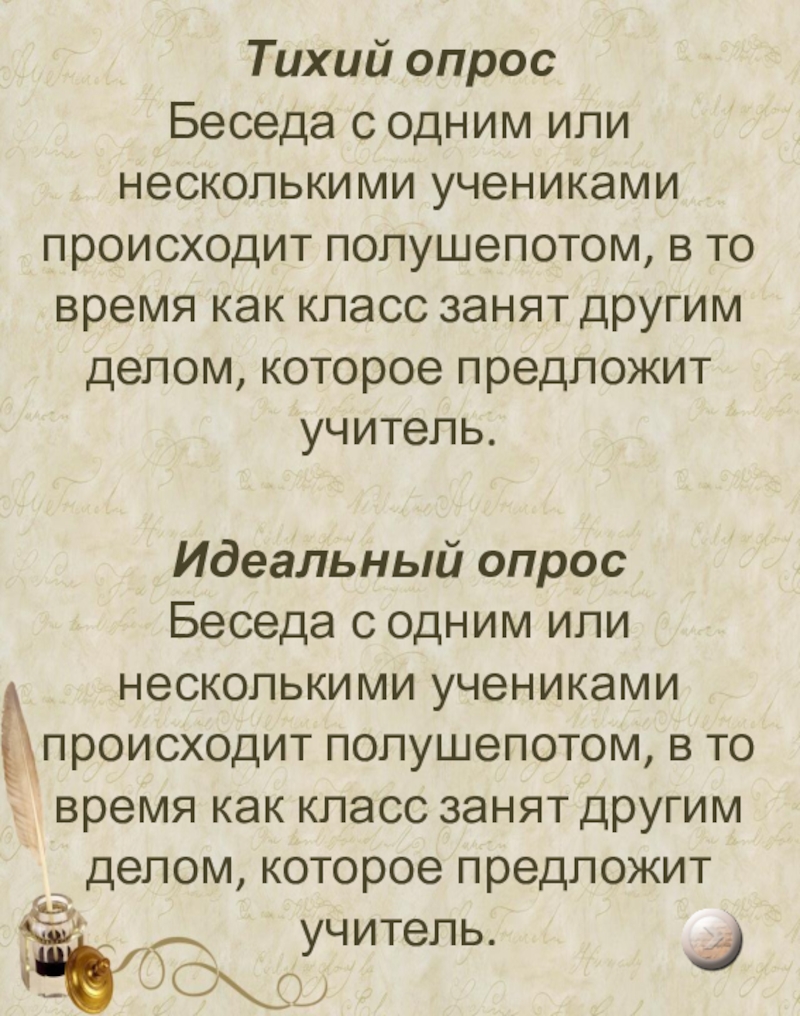 Беседа с одним или несколькими учениками происходит полушепотом, в то время как класс занят другим делом, которое предложит учитель.
