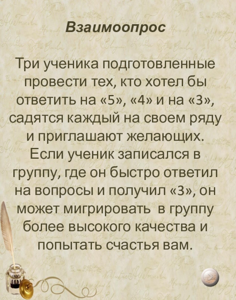 «4» и на «3», садятся каждый на своем ряду и приглашают желающих. Если ученик записался в группу, где он быстро ответил на вопросы и получил «3», он может мигрировать в группу более высокого качества и попытать счастья вам.