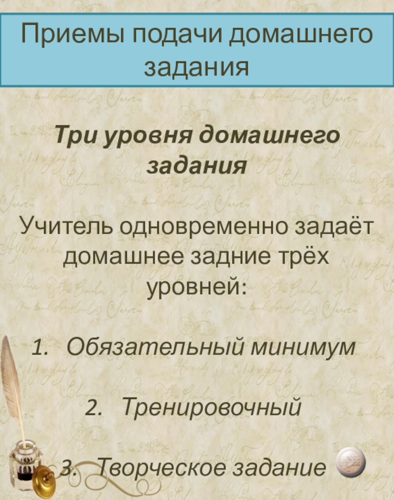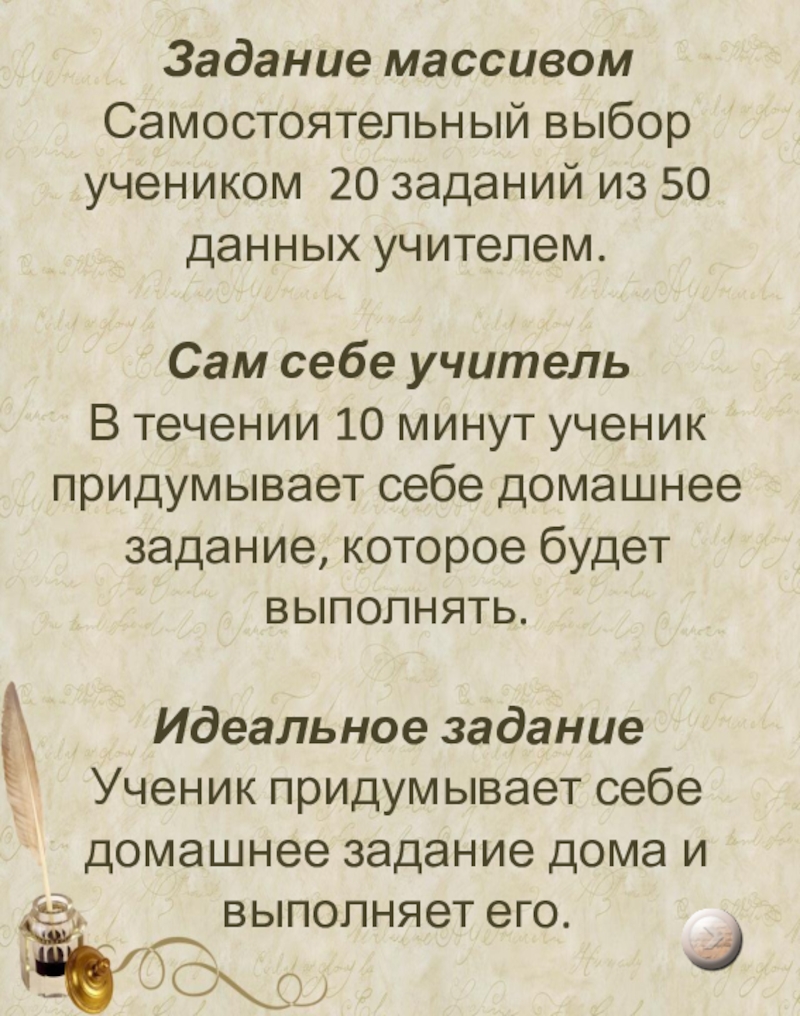 В течении 10 минут ученик придумывает себе домашнее задание, которое будет выполнять.