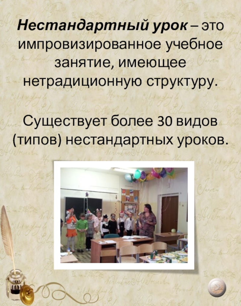 Слайд 18Нестандартный урок – это импровизированное учебное занятие, имеющее нетрадиционную структуру.
