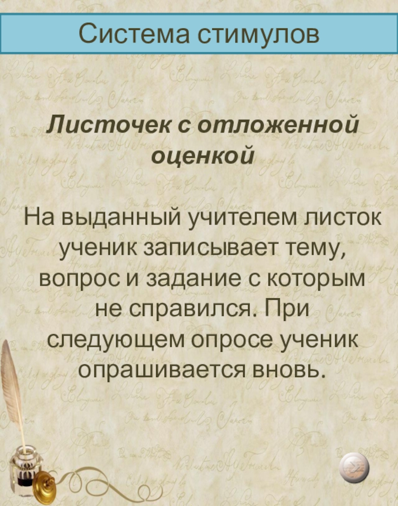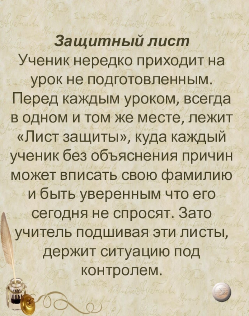 в одном и том же месте, лежит «Лист защиты», куда каждый ученик без объяснения причин может вписать свою фамилию и быть уверенным что его сегодня не спросят. Зато учитель подшивая эти листы, держит ситуацию под контролем.