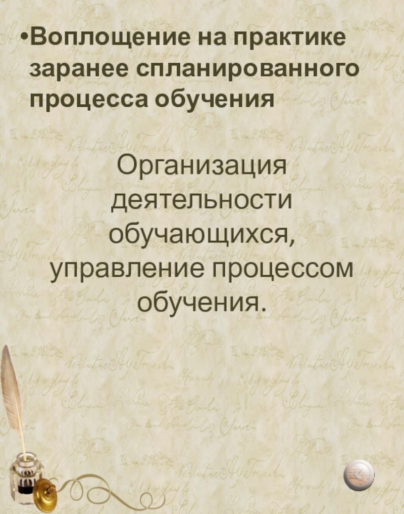 Слайд 6Воплощение на практике заранее спланированного процесса обучения