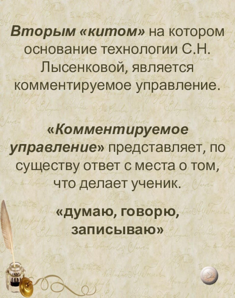 Слайд 109Вторым «китом» на котором основание технологии С.Н.Лысенковой, является комментируемое управление.
