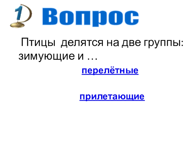 Слайд 45 Птицы делятся на две группы: зимующие и …
