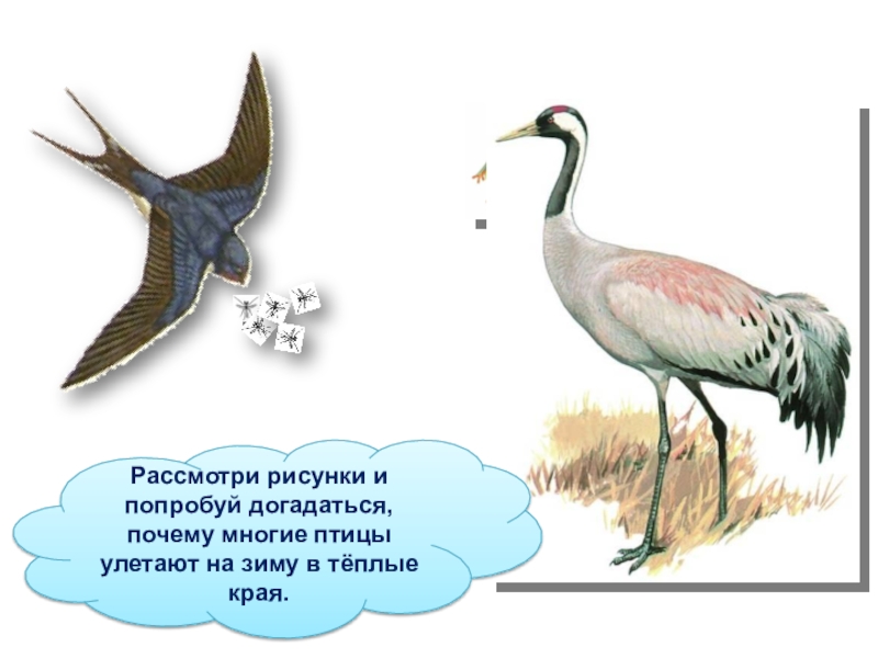 Слайд 25Рассмотри рисунки и попробуй догадаться, почему многие птицы улетают на зиму