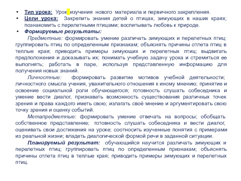 Предметные: формировать умение различать зимующих и перелетных птиц; группировать птиц по определенным признакам; объяснять причины отлета птиц в теплые края; приводить примеры зимующих и перелетных птиц; выдвигать предположения и доказывать их; понимать учебную задачу урока и стремиться ее выполнять; работать в паре, используя представленную информацию для получения новых знаний.