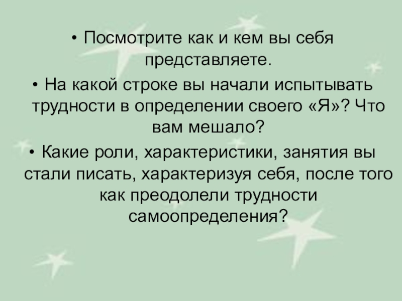 Посмотрите как и кем вы себя представляете.На какой строке вы начали испытывать трудности в определении своего «Я»?