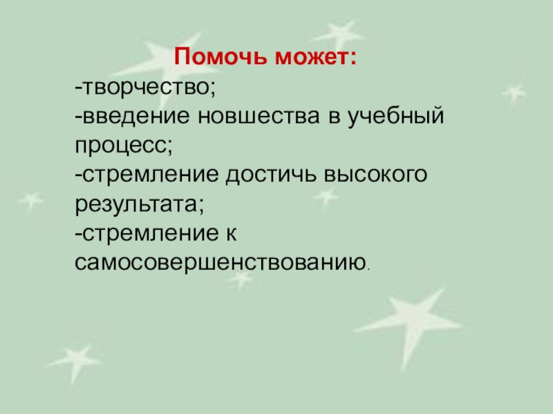 Помочь может:-творчество;-введение новшества в учебный процесс;-стремление достичь высокого результата;-стремление к самосовершенствованию.