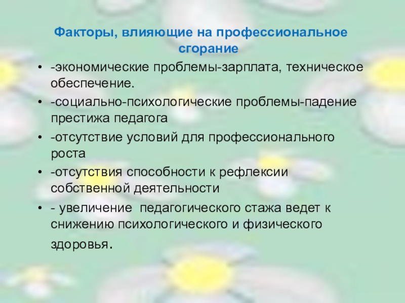 Факторы, влияющие на профессиональное сгорание-экономические проблемы-зарплата, техническое обеспечение.-социально-психологические проблемы-падение престижа педагога-отсутствие условий для профессионального роста-отсутствия способности к