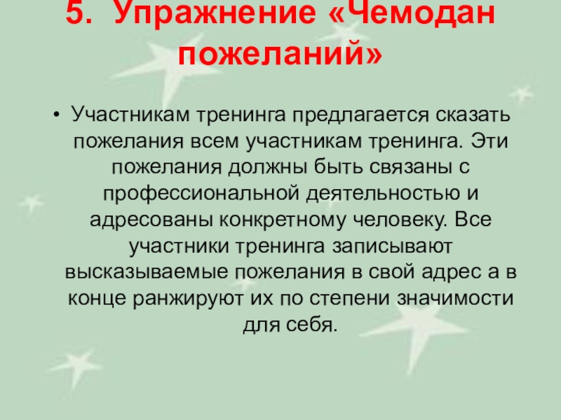 5. Упражнение «Чемодан пожеланий» Участникам тренинга предлагается сказать пожелания всем участникам тренинга. Эти пожелания должны быть связаны