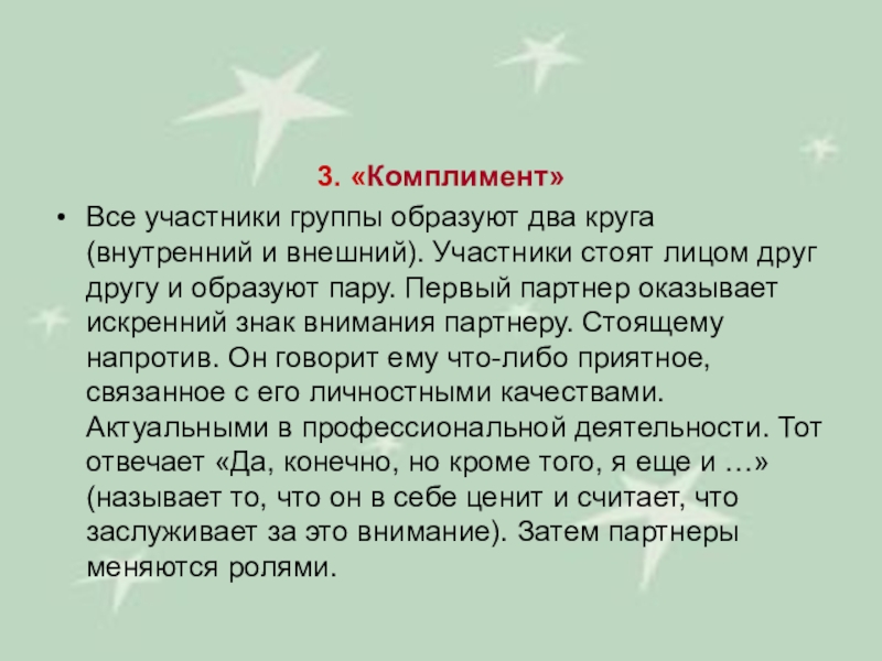 3. «Комплимент»Все участники группы образуют два круга (внутренний и внешний). Участники стоят лицом друг другу и образуют