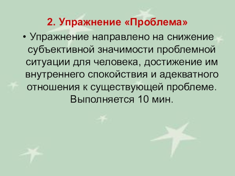2. Упражнение «Проблема»Упражнение направлено на снижение субъективной значимости проблемной ситуации для человека, достижение им внутреннего спокойствия и
