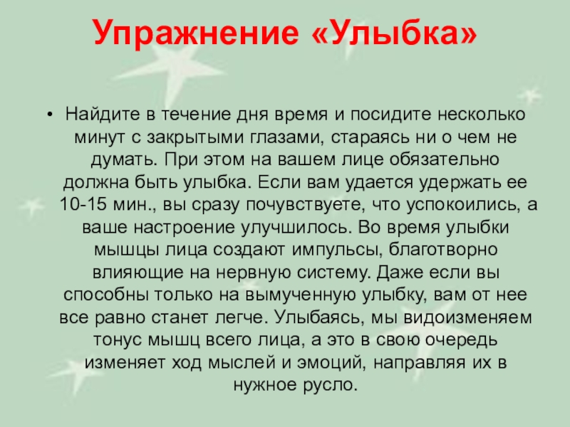 Упражнение «Улыбка» Найдите в течение дня время и посидите несколько минут с закрытыми глазами, стараясь ни о
