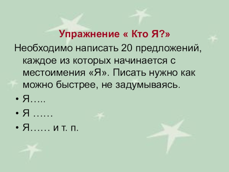 Упражнение « Кто Я?»Необходимо написать 20 предложений, каждое из которых начинается с местоимения «Я». Писать нужно как