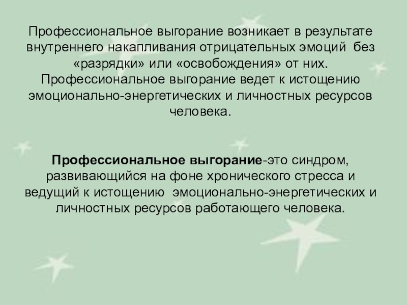 Профессиональное выгорание возникает в результате внутреннего накапливания отрицательных эмоций без «разрядки» или «освобождения» от них. Профессиональное выгорание ведет к истощению эмоционально-энергетических и личностных ресурсов человека. Профессиональное